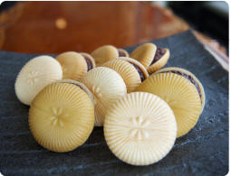 216円桃山生地でこし餡と渋皮栗を包んだ焼き菓子です。吉祥菓で贈り物にもたいへんご好評をいただいております。